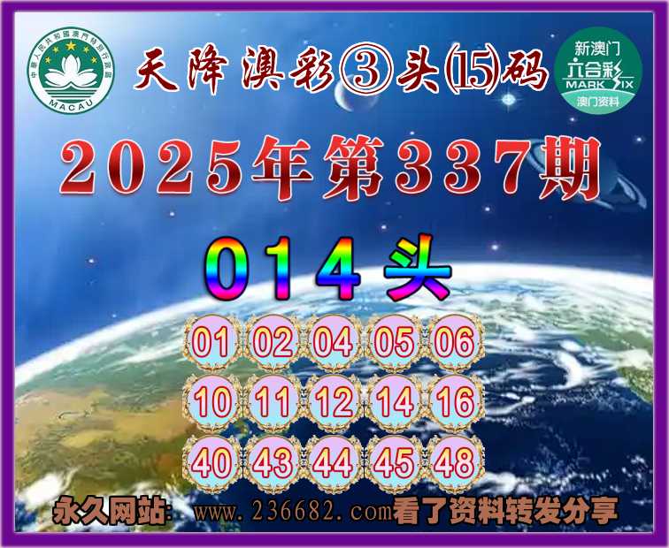 337期:《天降澳彩》 🥼③头⒂码🥼【014头】开:09